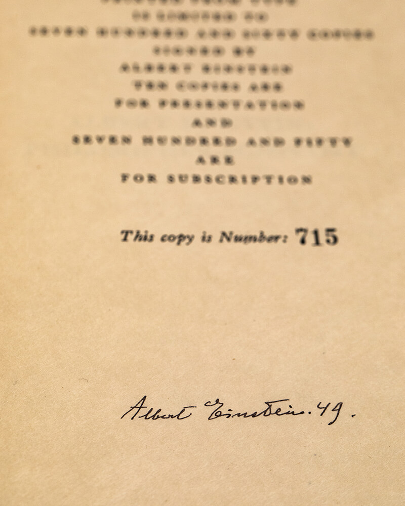 This #EINSTEIN is unrestored and is fine condition with few signs of wear. This volume is in Octavo format, is bound in the original publisher’s leatherette and comes with its original slipcase and glassine. The front page of #EINSTEIN displays its unique series number (715) and the handwritten inscription “Albert Einstein ‘49”. Paul Arthur Schilpp served the editor of this issue, which also features a frontispiece portrait of the author by Yousef Karsh.