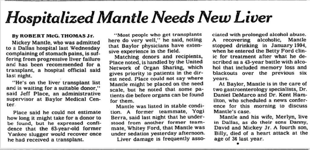 His drinking had accelerated in the last couple decades of his life after the terminal diagnosis of his 19-year-old son Billy, who eventually died of Hodgkin’s lymphoma. Yet another example of the Mantle curse.