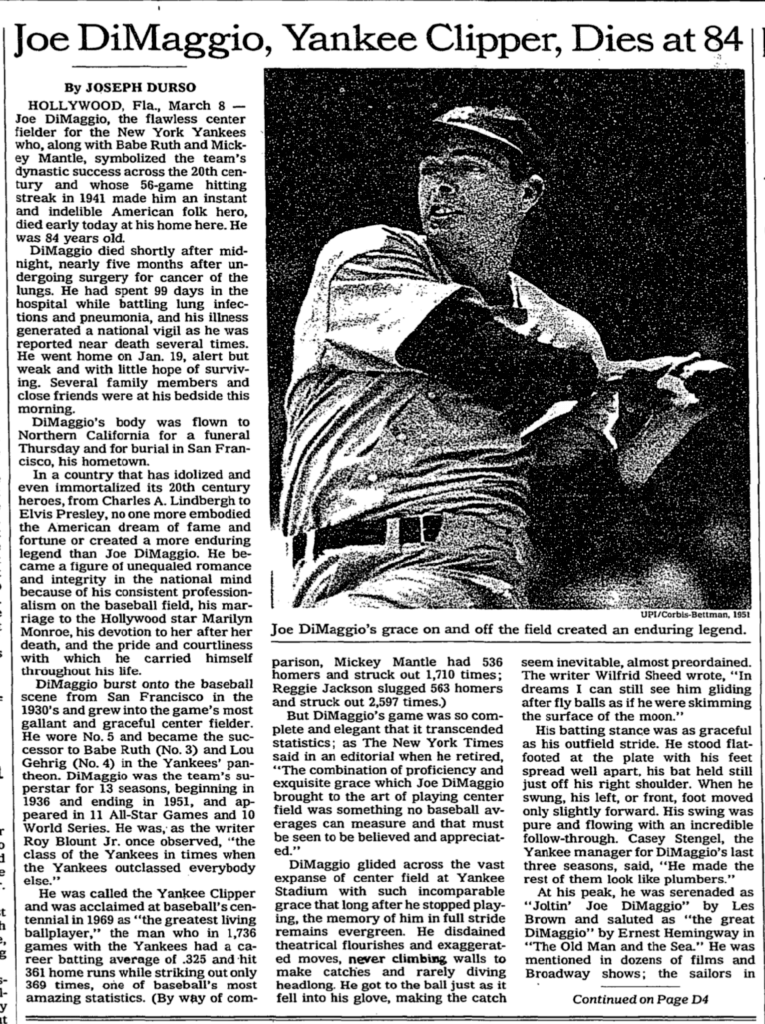 “There was a majesty in his swing, and a self-assured confidence in style and conduct that was uniquely Joe DiMaggio’s. In the eye of his public, he was more than a sports hero. He was among the most cherished icons of popular culture.”