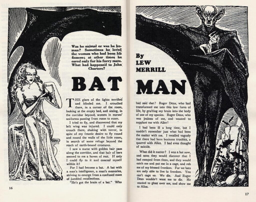 Shortly thereafter, another pulp magazine, Spicy Mystery Stories, ran a tale simply titled “Bat Man.” This wild story featured a disturbed main character who believed he had swapped brains with a bat amidst an imagined love triangle – a far cry from the brooding vigilante we know today.