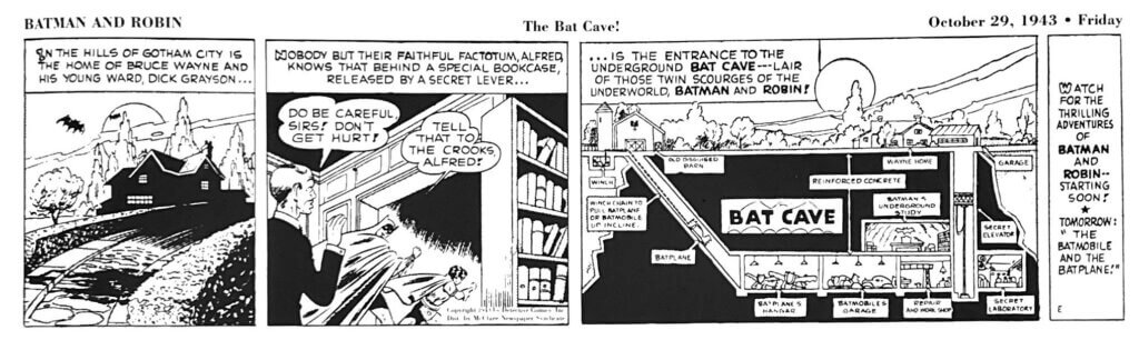 The serial’s Batcave was an intriguing enough idea that Batman co-creator Bob Kane decided to incorporate it into one of the early daily Batman newspaper strips. On October 29, 1943, fans saw a cutaway that mapped out Batman’s underground lair with far more depth and complexity than what was seen in the serial. This would be the first time it was actually called “The Bat Cave.”
