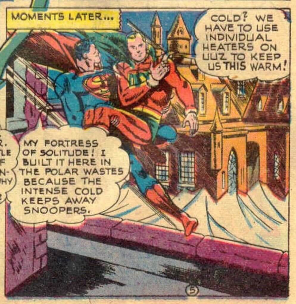 You know what else happened in the summer of 1949? Superman debuted a new base in issue #58. “My Fortress of Solitude!,” he proclaims. “I built it here in the polar wastes because the intense cold keeps away snoopers.” At least the Superman creative team waited until Doc Savage was over before they swiped it.
