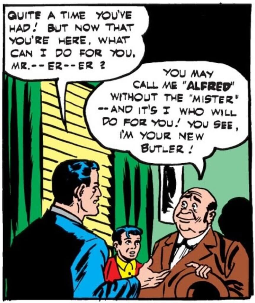 Loyal butler Alfred wouldn’t appear until Batman #16 (April 1943), but there is apparently evidence that he was created by the writers of the Batman live-action serial. DC then asked the comic writers to introduce Alfred so that the books paralleled what fans would see in theaters.