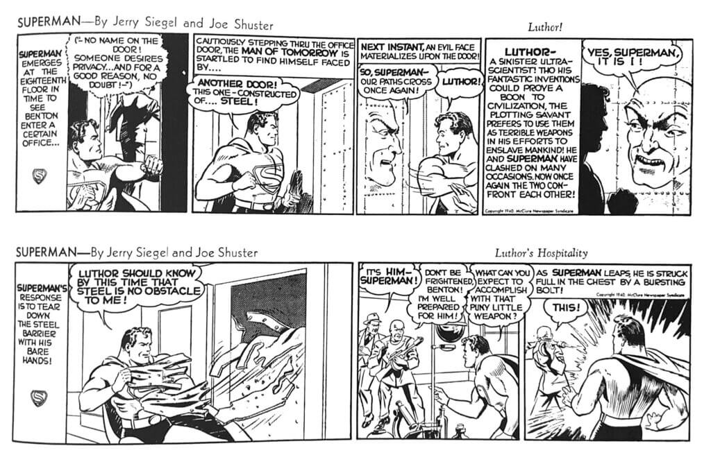 It wasn’t until November 1940 that he first appeared bald in the daily Superman newspaper strip. Superman co-creator Joe Shuster ran a team of ghost artists to keep up with the ever-growing content demands while battling deteriorating vision. One young artist, Leo Nowak, drew Luthor bald during this series. The change uncontested, Nowak drew Luthor bald again in Superman #10 (May-June 1941) and the evil mastermind stayed that way from then on.
