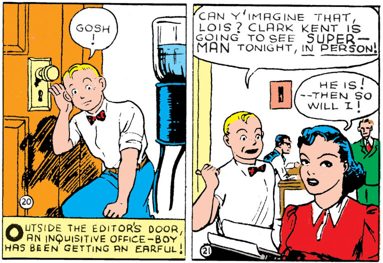 “As our story opens today, Clark Kent is about to leave the Daily Planet building when he is hailed by young Jimmy Olsen, a red-headed, freckle-faced copy boy who works in the editorial department of the paper.”