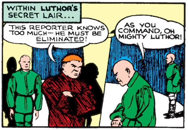 Speaking of hairstyles, Superman’s greatest nemesis, Luthor, debuted in Action Comics #23 (April 1940) with a shock of red hair (the “Lex” would come later). Throughout subsequent comics appearances, this look persisted.
