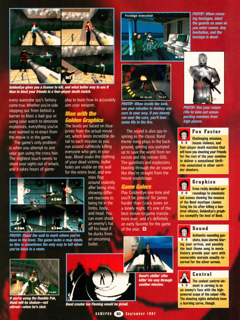 “GoldenEye sets a new standard on N64 for graphics, sound (switch on that subwoofer), and multiplayer action.” Schneider, IGN