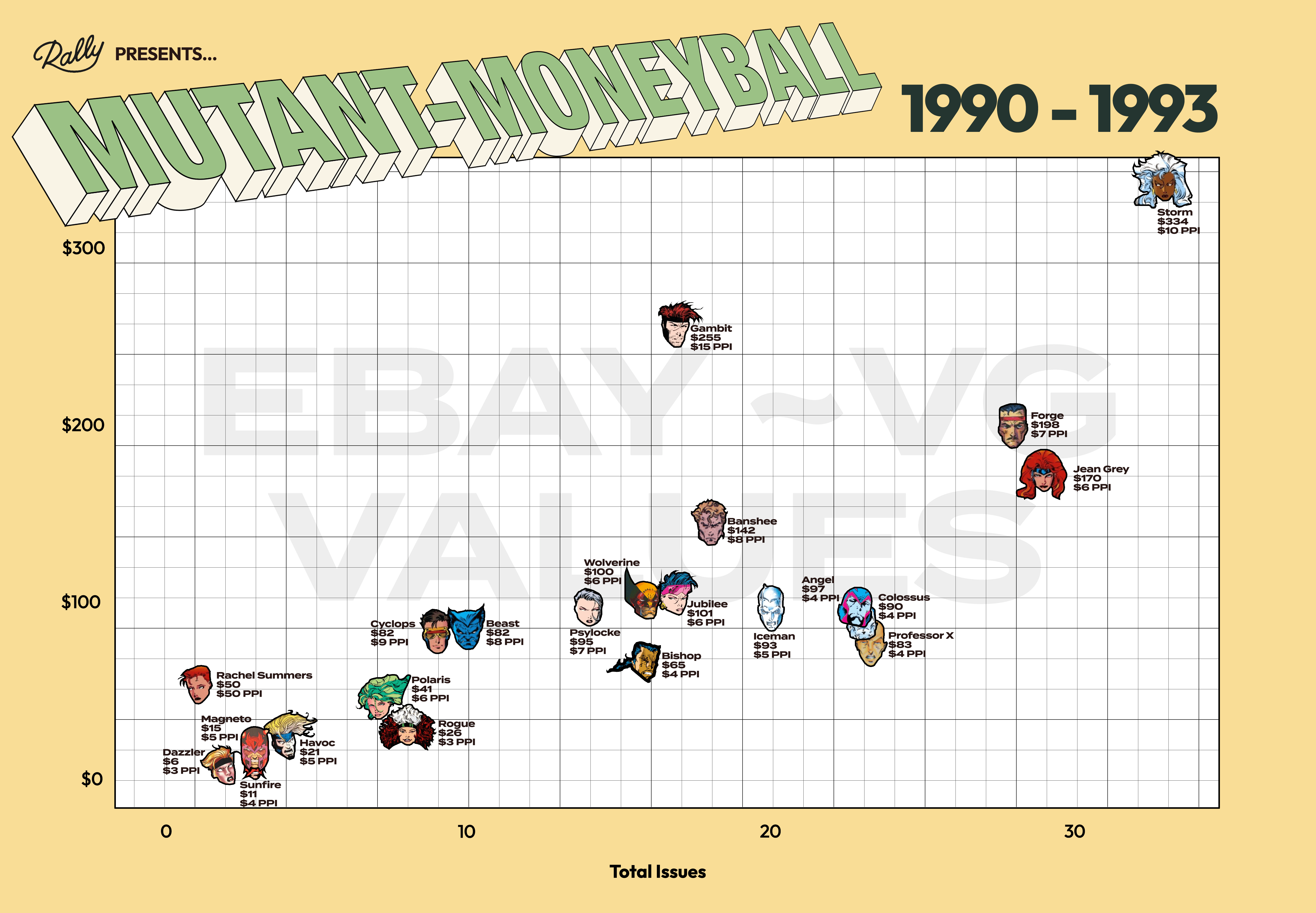 Least Valuable Mutant(s): Sunfire with an average $1 per issue (Declared VG condition) and Jubilee with $74 per issue (Graded 9.6-9.9)