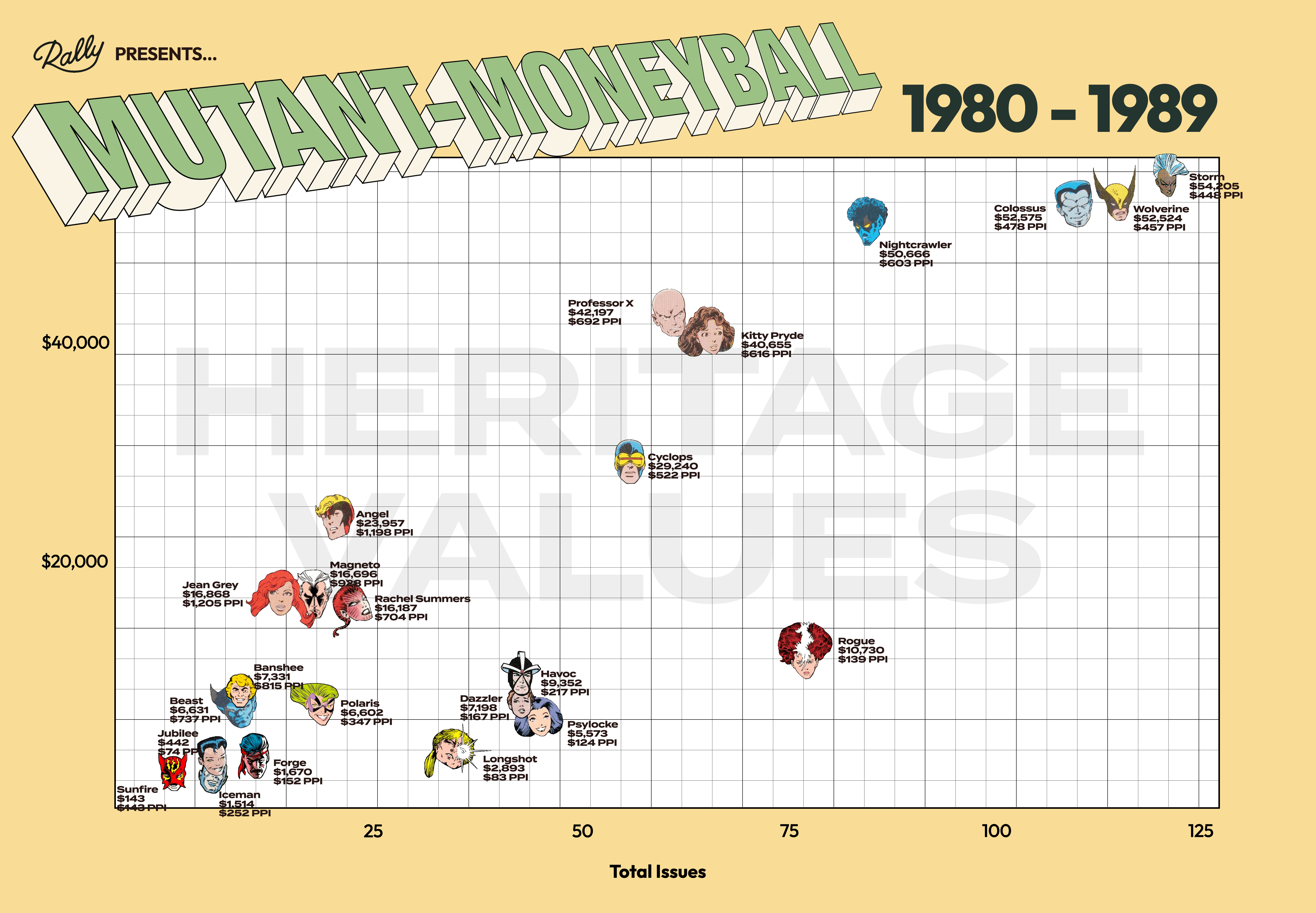 Most Valuable Mutant(s): Jean Grey with an average $48 dollars per issue (Declared VG condition) / $1,205 per issue (Graded 9.6-9.9)