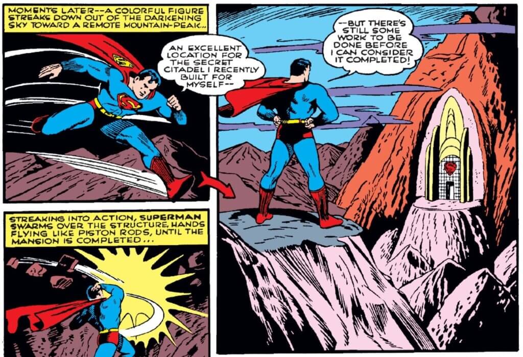 Eventually, Superman was granted a “secret citadel” in Superman #17 (Summer 1942) just outside of Metropolis. The descriptive narration reads, “His task completed, Superman relaxes within his mountain retreat surrounded by trophies of his many crime-battles…” – quite different from the Superman base we all know and love.