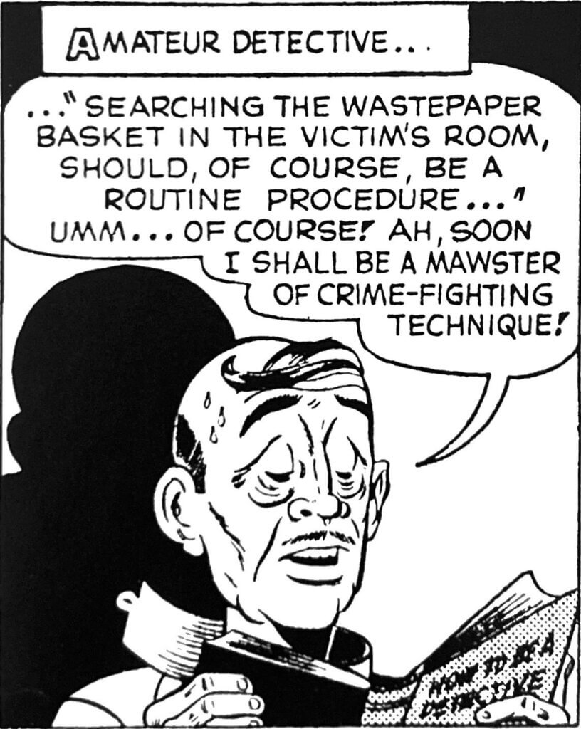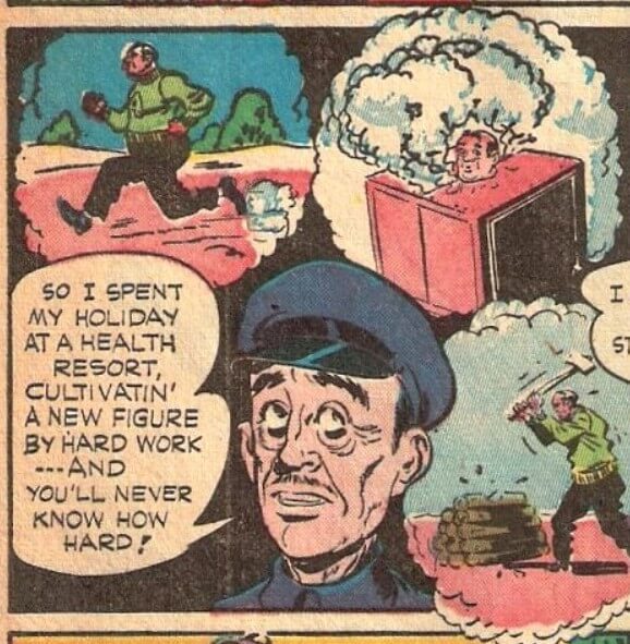 Not surprisingly for the time, there was no effort to standardize the character. The comics version of Alfred was portly and clean-shaven while the serial version, played by William Austin, was trim and wore a thin mustache. The first time he resembled Austin in print was in the daily Batman newspaper strip “Meet Alfred!,” which ran in 1943. He would lose the spare tire and grow a mustache in the main comic series all in the course of a single issue, Detective Comics #83 (January 1944). This was most assuredly not healthy, but at least the writers attempted to address Alfred’s change in appearance.