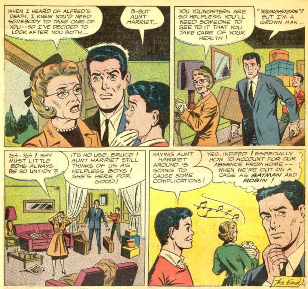Even that wasn’t enough. DC decided to reduce the testosterone in the manor even further by smashing Alfred with a boulder in Detective Comics #328 (June 1964) and replacing him with Robin’s Aunt Harriet.