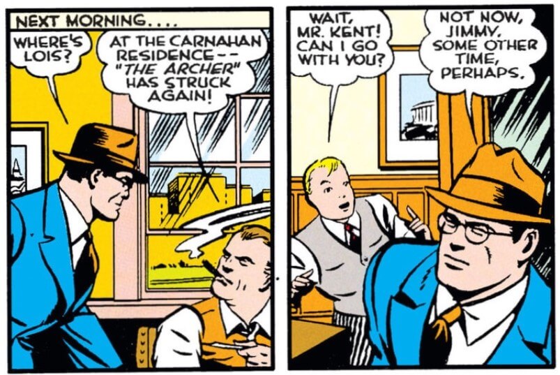 “As our story opens today, Clark Kent is about to leave the Daily Planet building when he is hailed by young Jimmy Olsen, a red-headed, freckle-faced copy boy who works in the editorial department of the paper.”
