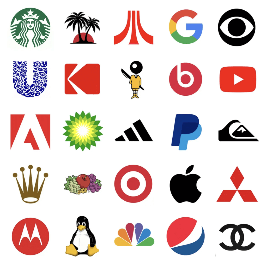 And it’s the translation of a person into an ideal through repetition and aspiration. Like these logos without their company names. A little marketing fairy gets their wings when you recognize that that blue P is PayPal.